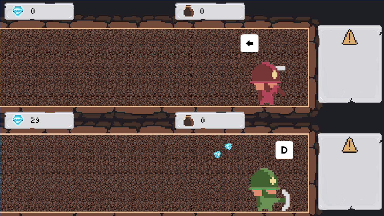 Your objective is to mine diamonds faster than your opponent by mashing Left and Right but pay attention to the warning icon ! Each time you press a key the cave may collapse and you will loose all of your diamonds